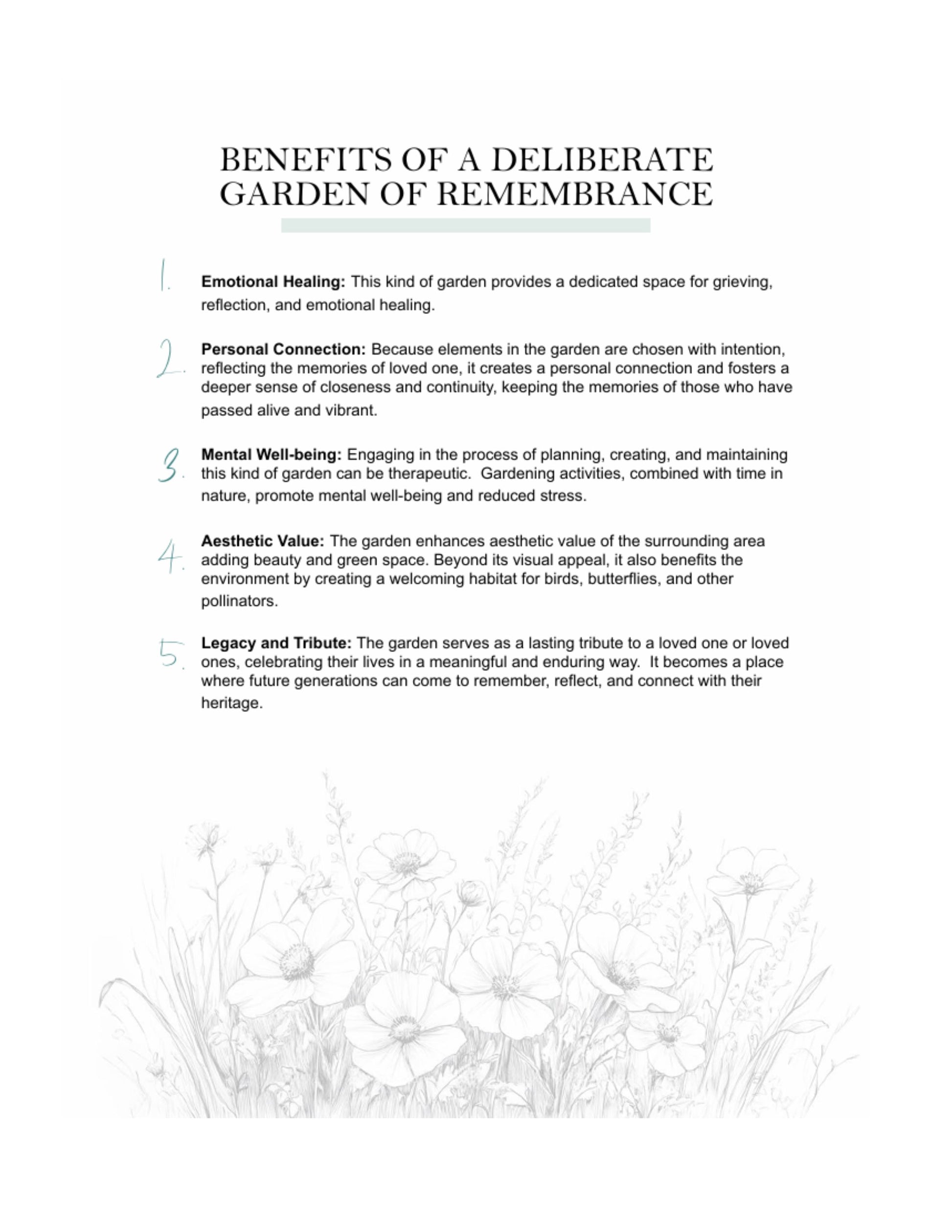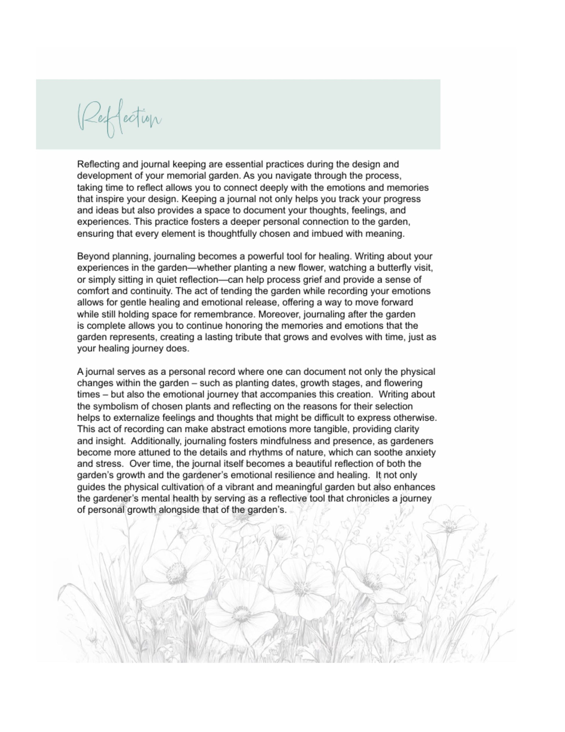 The Deliberate Remembrance Garden Workbook is a 126-page digital guide created to gently help you channel grief into something meaningful. Through guided reflection, plant symbolism, and intentional planning, this workbook walks you step by step through designing a remembrance garden that honors your loved one and gives your emotions a place to land.
