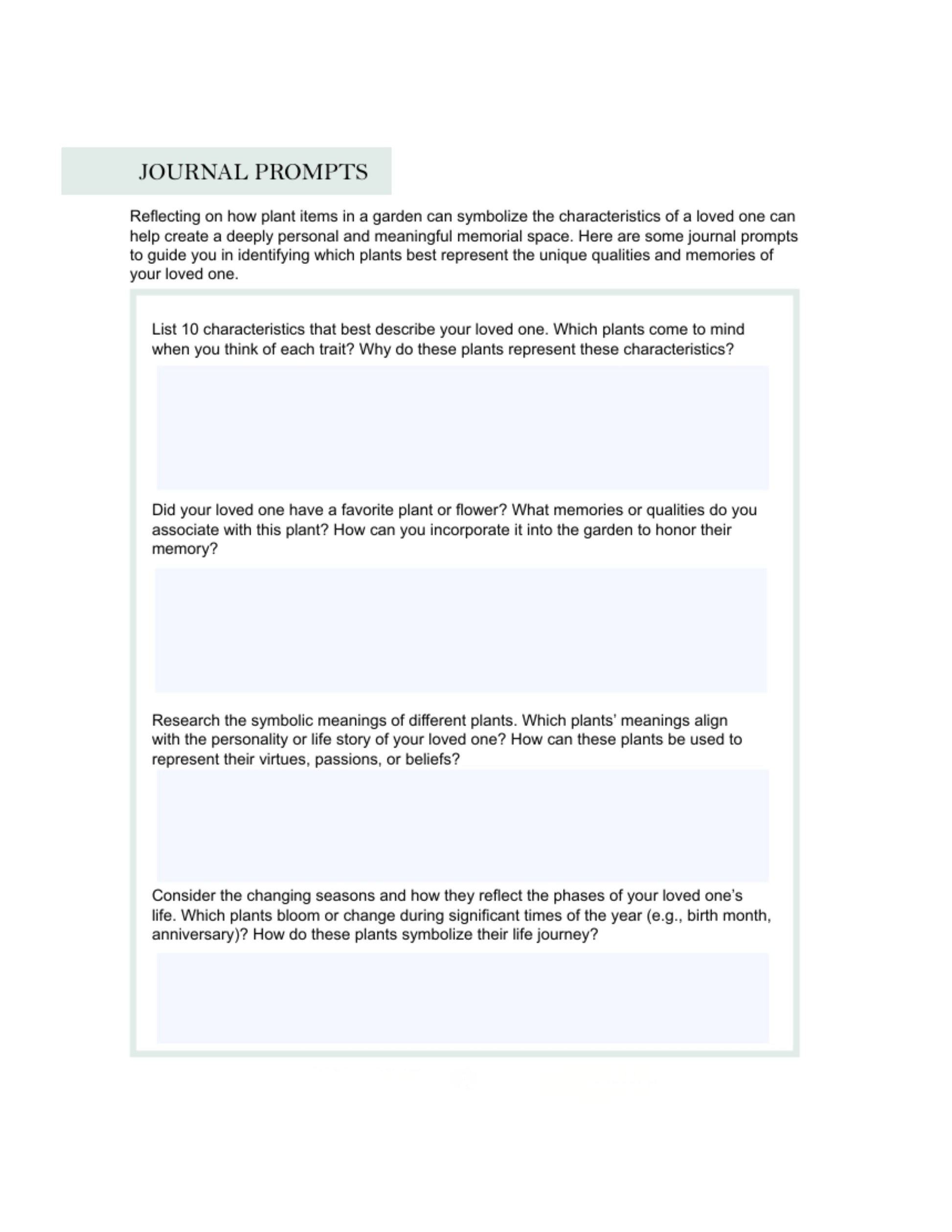 This is an interactive, click-and-fill PDF designed for use on a laptop or desktop computer, allowing you to type, reflect, and plan directly within the workbook at your own pace. You may also print the workbook if you prefer. Inside, you’ll find thoughtful prompts, symbolism guides, and practical templates to support both emotional reflection and physical garden planning.